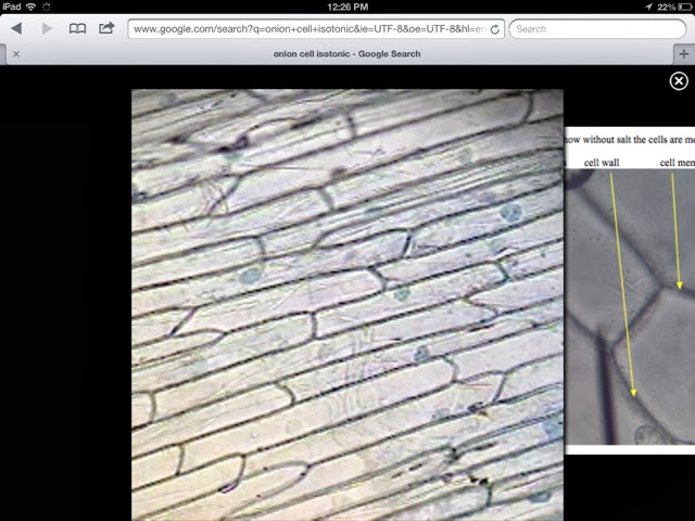 Part1E) In this part of the lab we looked at images of an onion cell in an isotonic, hypotonic and hypertonic solutions. Respectively, when a cell has equal amounts of water going in and out, too much water going in, and too little water. We looked at traces of plasmolysis. Plasmolysis is the shriveling and eventual death of a cell due to lack of water.
